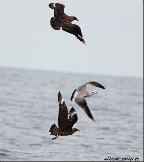 Los que sí dieron juego, fueron los Págalos grandes. Carroñero y predador, es conocido su hábito de acosar a otras especies, para que suelten o regurgiten sus presas, un comportamiento conocido como “cleptoparasitismo”. En este caso es una Patiamarilla, pero no pierden ocasión en hacer lo mismo con Alcatraces, Pardelas, Cormoranes, etc….